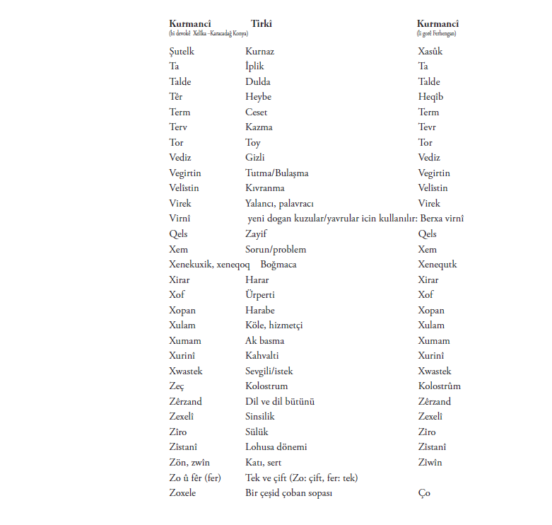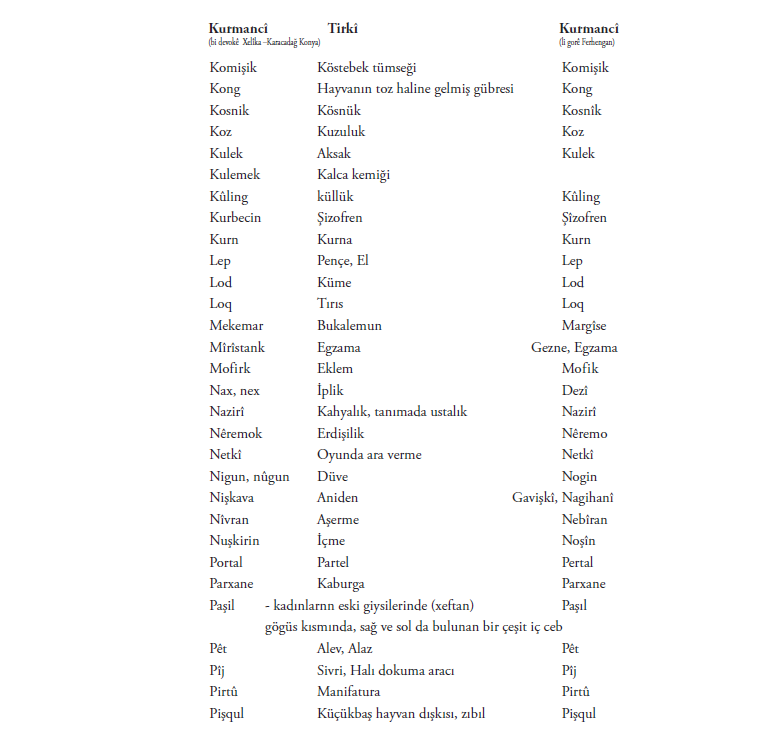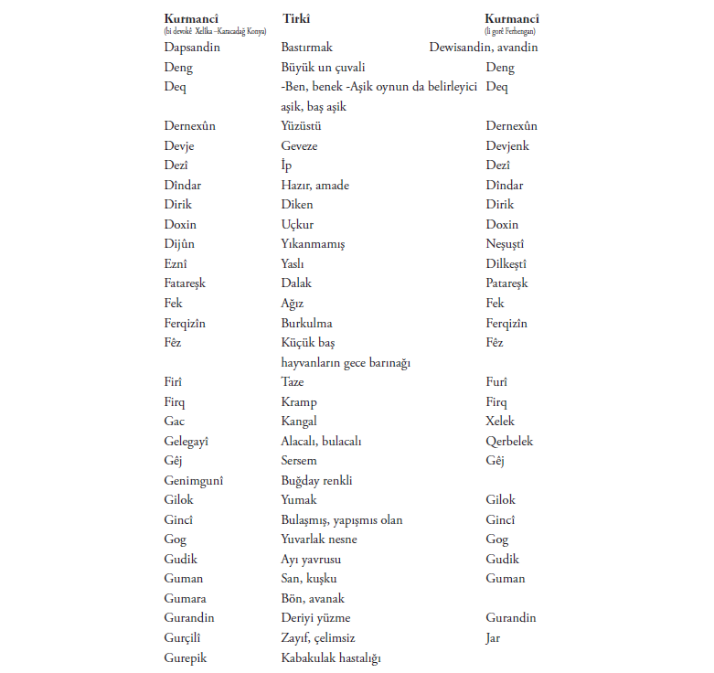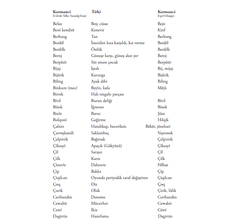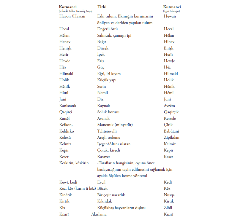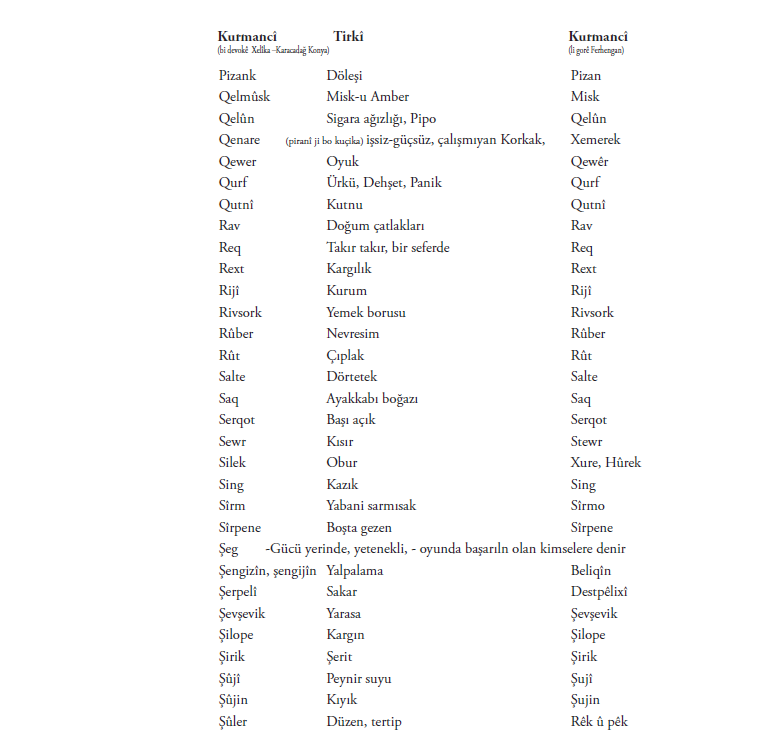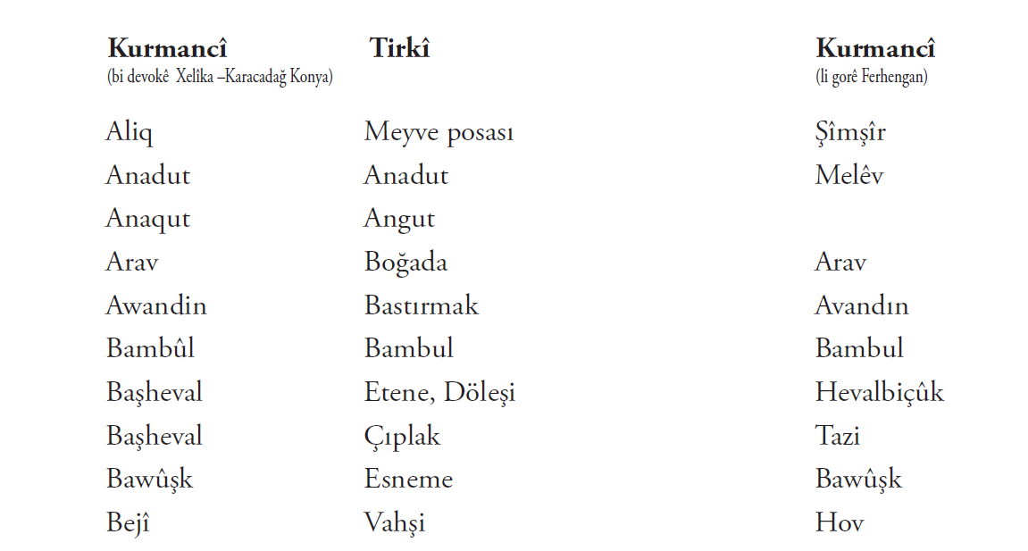 Di vê nivîsê de bi piranî nav û lêkerên ku min jê hilbijartî hene. Me maneya hinek peyva a bi tirkî û hinekan jî bi kurmaciya wan a Kurdistanê nedît. Ger hûn bizanibin, kerema xwe ji me re binivîsin!